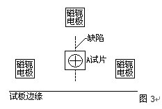 ②为了便于用千分尺测量漆层厚度,受千分尺结构尺寸所限,缺陷刻制在试板近边缘部分,因此所使用的四极旋转磁场电磁轭只能用上三只磁极,第四极悬空。
